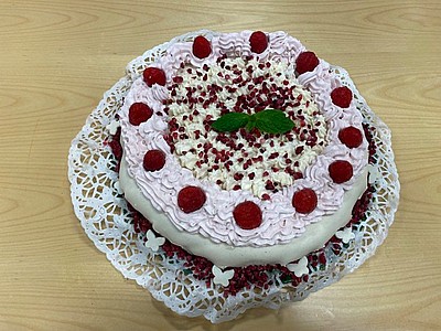 Lag: Vera N, Kajsa, Albin Ö och Rasmus hade hallontema rätt igenom och med vackra spritsdetaljer döptes tårtan till Hallonbomb.